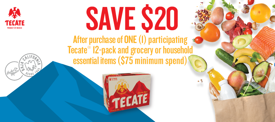 Save $20 after purchase of ONE (1) participating Tecate 12-pack and grocery or household essential items ($75 min spend)