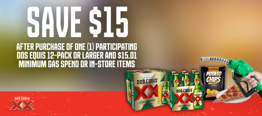 Save $15 after purchase of ONE (1) participating Dos Equis 12-pack or larger and $15.01 min gas spend