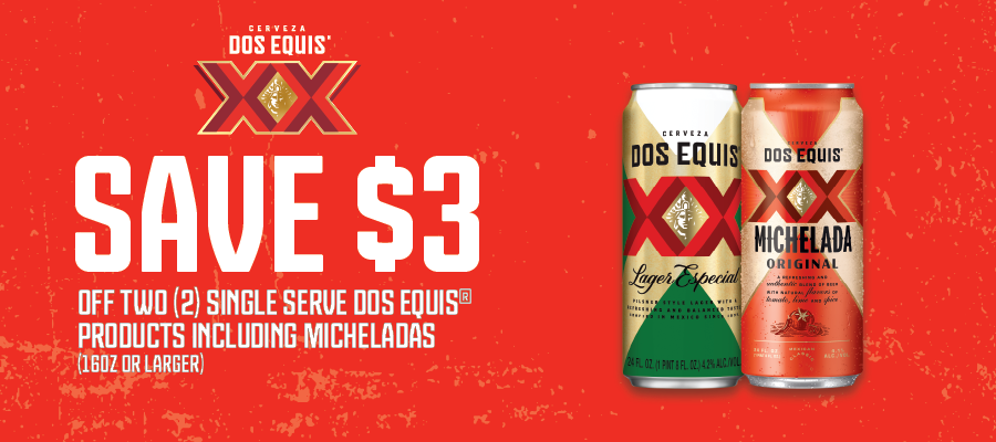 Save $3 off TWO (2) Single Serve Dos Equis Products including Michelada’s (16oz or Larger)