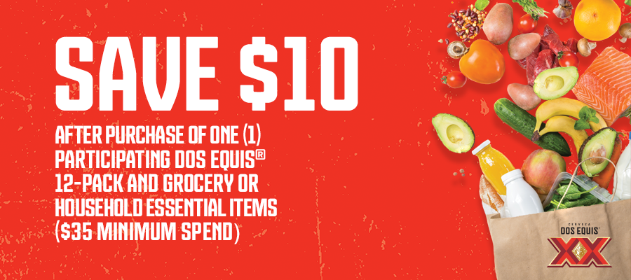 Save $10 after purchase of ONE (1) participating Dos Equis 12-pack and grocery or household essential items ($35 min spend)