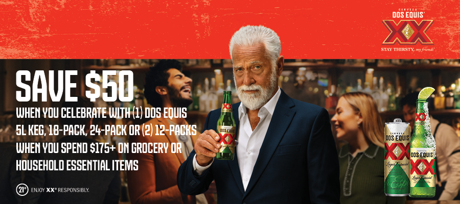 To receive a $50.00 rebate you must purchase (1) Dos Equis 5L Keg, 18-pack, 24-pack or (2) 12-packs and spend $175+ on grocery or household essential items.