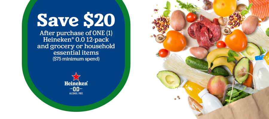 Save $20 after purchase of ONE (1) Heineken 0.0 12-pack and grocery or household essential items ($75 min spend)