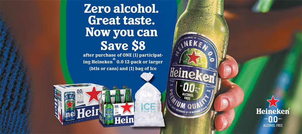 Save $8 after purchase of ONE (1) participating Heineken 0.0 12-pack or larger (btls or cans) and ONE (1) bag of Ice