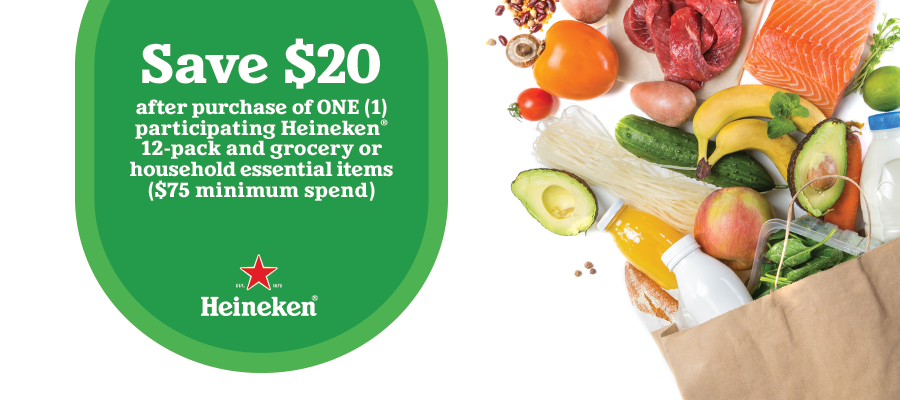 Save $20 after purchase of ONE (1) participating Heineken 12-pack and grocery or household essential items ($75 min spend)