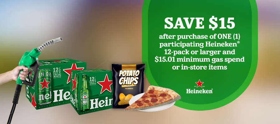 Save $15 after purchase of ONE (1) participating Heineken 12-pack or larger and $15.01 min gas spend