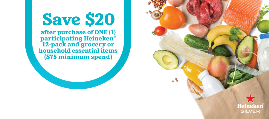 Save $20 after purchase of ONE (1) Heineken Silver 12-pack and grocery or household essential items ($75 min spend)