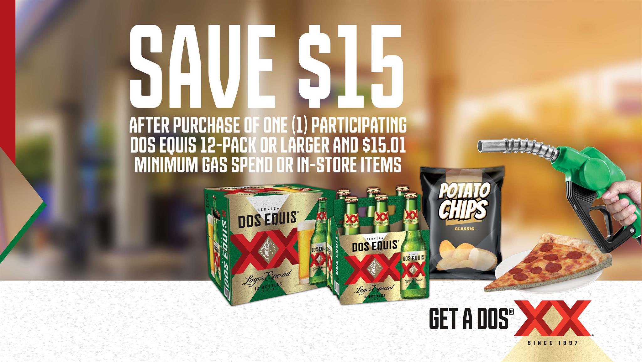 Save $15 after purchase of ONE (1) participating Dos Equis 12pk or larger and $15.01 min gas spend or in-store items – Excludes RTD’s