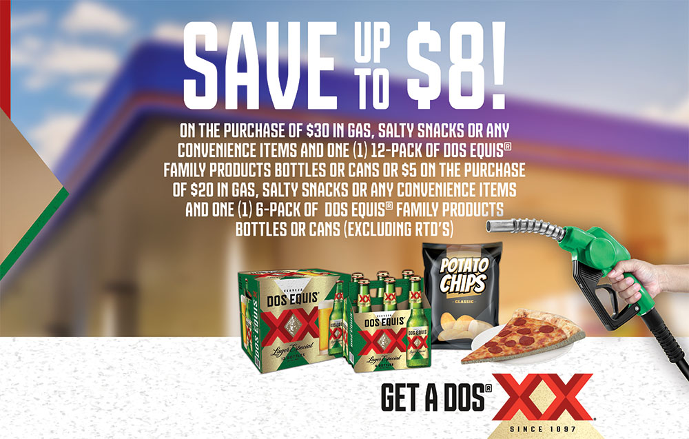 Save on the purchase of $30 in gas, salty snacks or any convenience items and one (1) 12-pack of Dos Equis® family products bottles or cans OR $5 on the purchase of $20 in gas, salty snacks or any convenience items and one (1) 6-pack of Dos Equis® family products bottles or cans (excluding RTD’s)